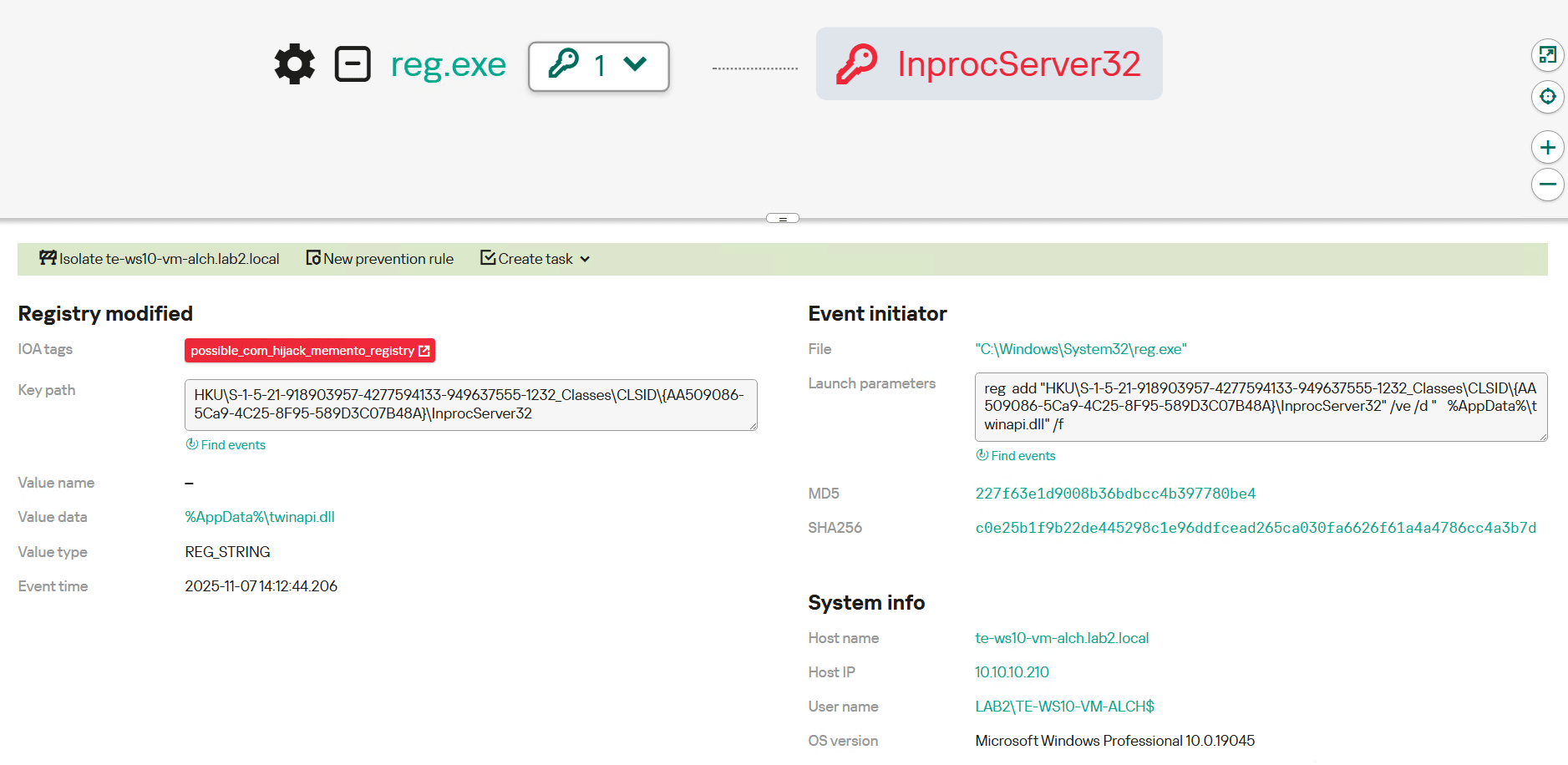This rule detects an attempt at system persistence via the COM object hijacking technique, which exploits peculiarities in the Windows COM component resolution process. This feature allows malicious actors to create custom CLSID entries in the user-specific registry branch, thereby overriding legitimate system components. When the system attempts to instantiate the corresponding COM object, the malicious payload executes instead of the original code.