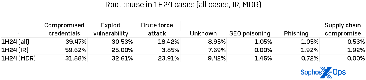Compromised credentials: We also spotlighted the rise in compromised credentials as a root cause of attacks in our second 2023 report. In 2023, 56 percent of all incidents had compromised credentials as their root cause. In the first half of 2024, that dominance was dialed back somewhat. Though compromised credentials were still the leading root cause overall for 2024, that number was led mainly by the IR cases, as shown in Figure 7. For MDR customers, exploited vulnerabilities led the root-cause leaderboard, though by less than one percent.