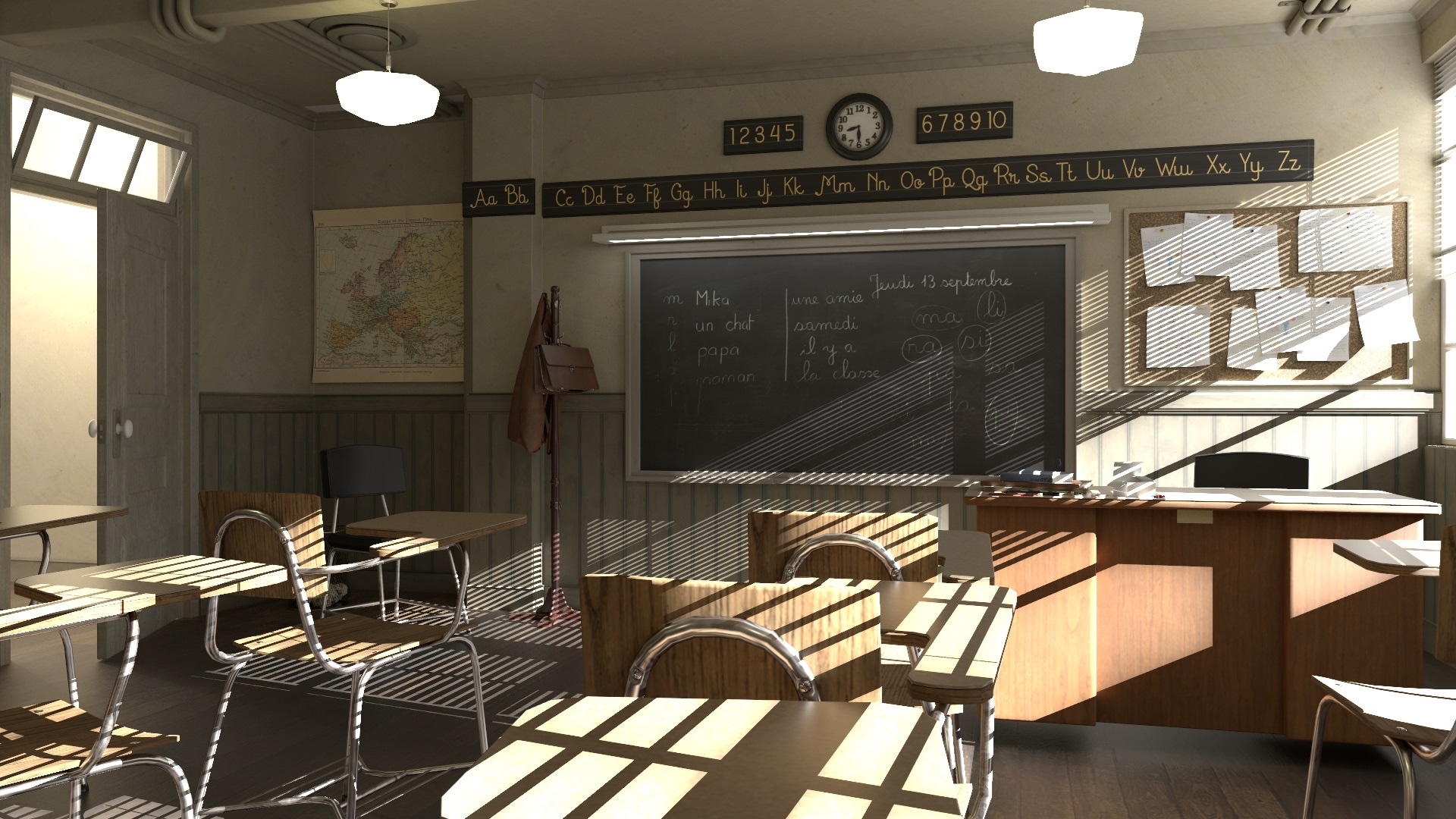 Figure 1. Photorealistic rendering by path tracing with 32768 samples per pixel. (Classroom rendered by Capsaicin [10].) – link to fullsize image (4MB)